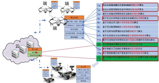 根据算法应用特点,可在低算力智能体端部署5类算法,充分利用云上高算力部署2类算法成果,通过端-端协同,云-端协同,实现多智能体广域自主感知,如图2所示。