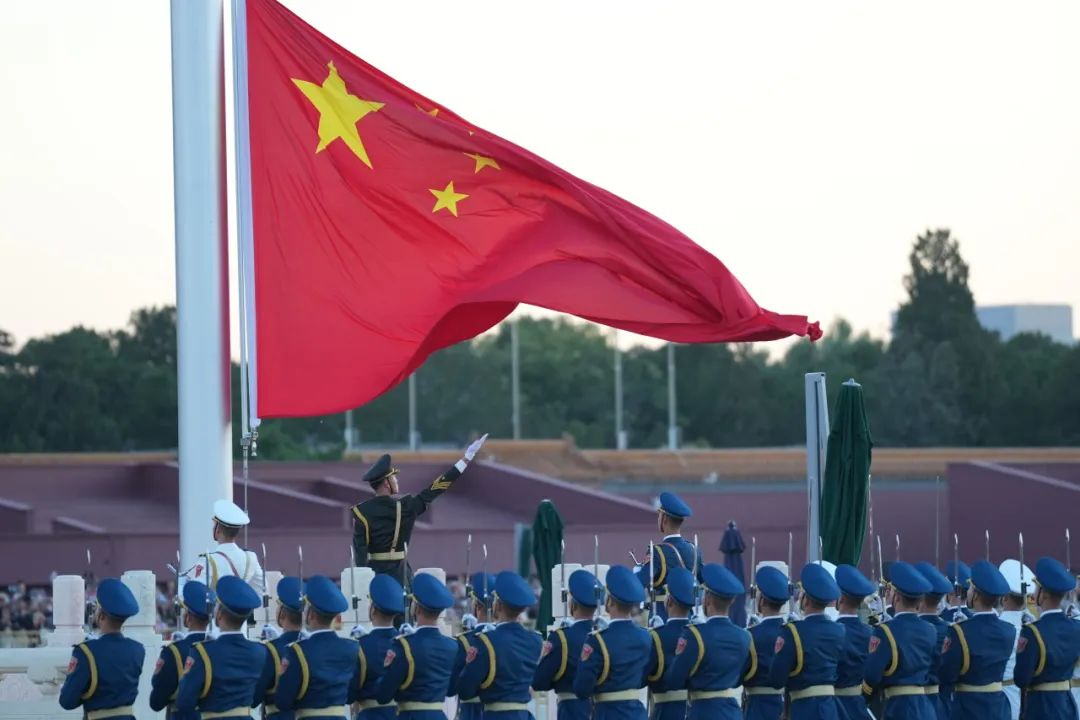 凌晨3点40分,全体观礼学生整装待发,心情无比激动。晨光熹微,北京时间6时07分,鲜艳的五星红旗在雄壮的《义勇军进行曲》中冉冉升起,迎着微风飘扬。全场庄严肃立,共同见证这神圣庄重的时刻。同学们心潮澎湃,将对祖国诚挚的祝福在国歌声中默默传颂。站在红旗下遥想中华民族百年奋斗历程,同学们深深地感受到了时代和国家赋予青年人的责任,空天报国之志更加坚定。