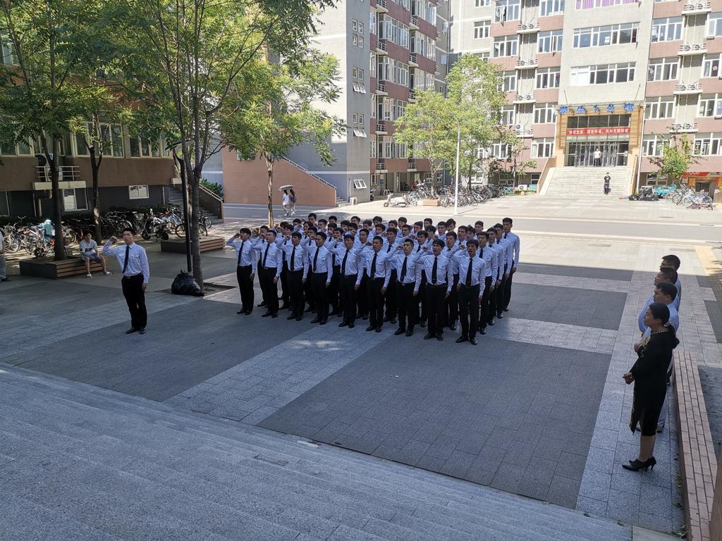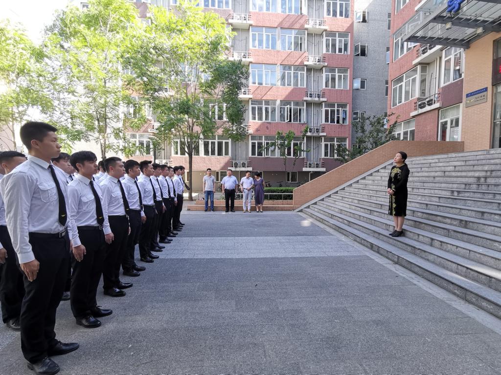 首先,学员们向领导们展示了队列表演。在领队苏子鹏同学的指挥下,学员们迈着整齐的步伐,喊着嘹亮的口号齐步走至二公寓楼前。他们用干净利落的动作配以坚定的眼神展现出国学员应有的信心与决心。