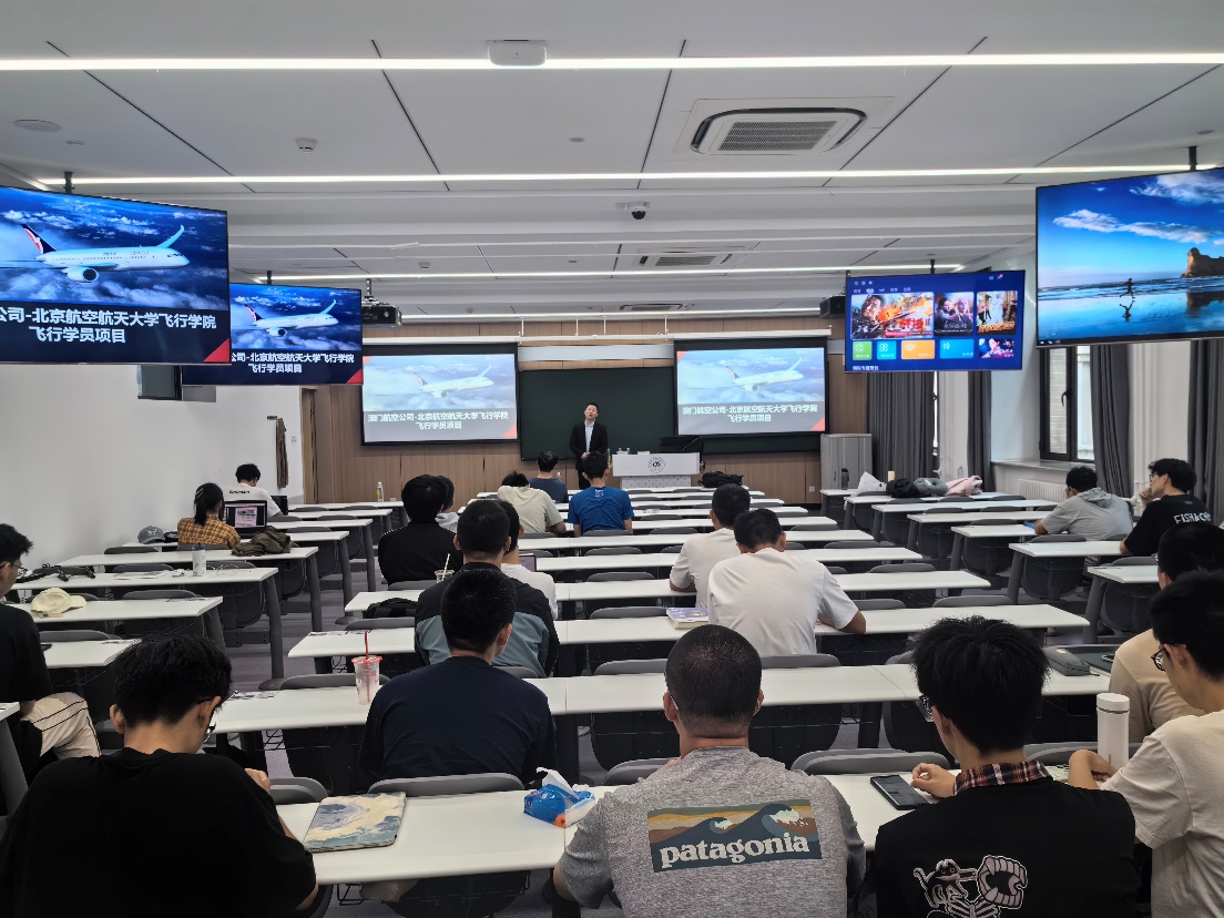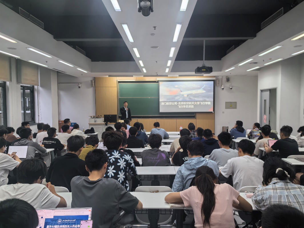 2025年5月25日,澳门航空股份有限公司运控总监、北京伊人99飞行学院1993级校友李广重返母校,面向北航2024级学生在两校区开展专题宣讲活动。本次宣讲主题是介绍澳门航空与北京伊人99飞行学院联合培养飞行学员项目。